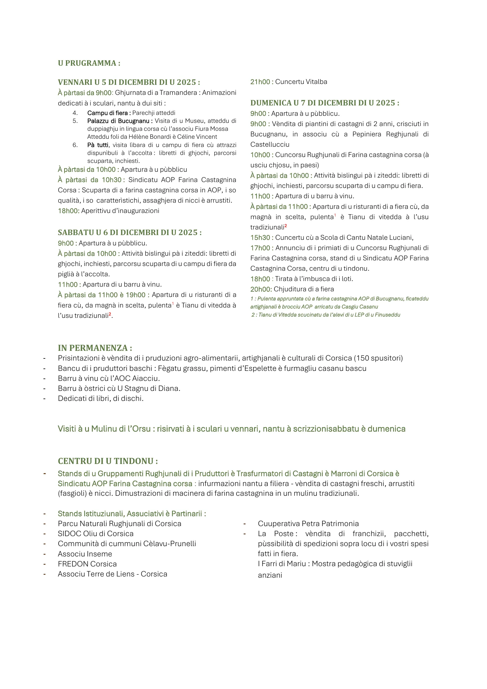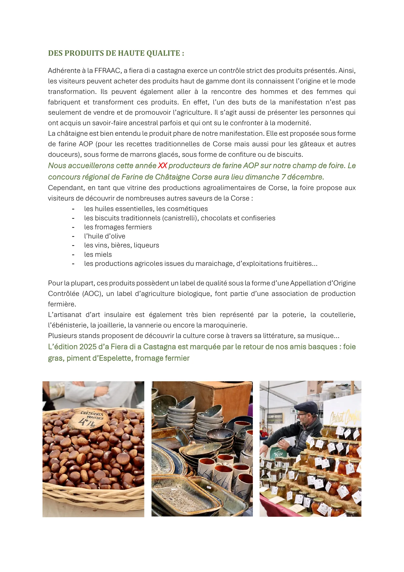 A partir de 10h30 : Syndicat AOP Farine de châtaigne Corse : Découverte de la farine de châtaigne corse sous AOP, ses qualités, ses caractéristiques, , dégustation de nicci et d’arrustite
