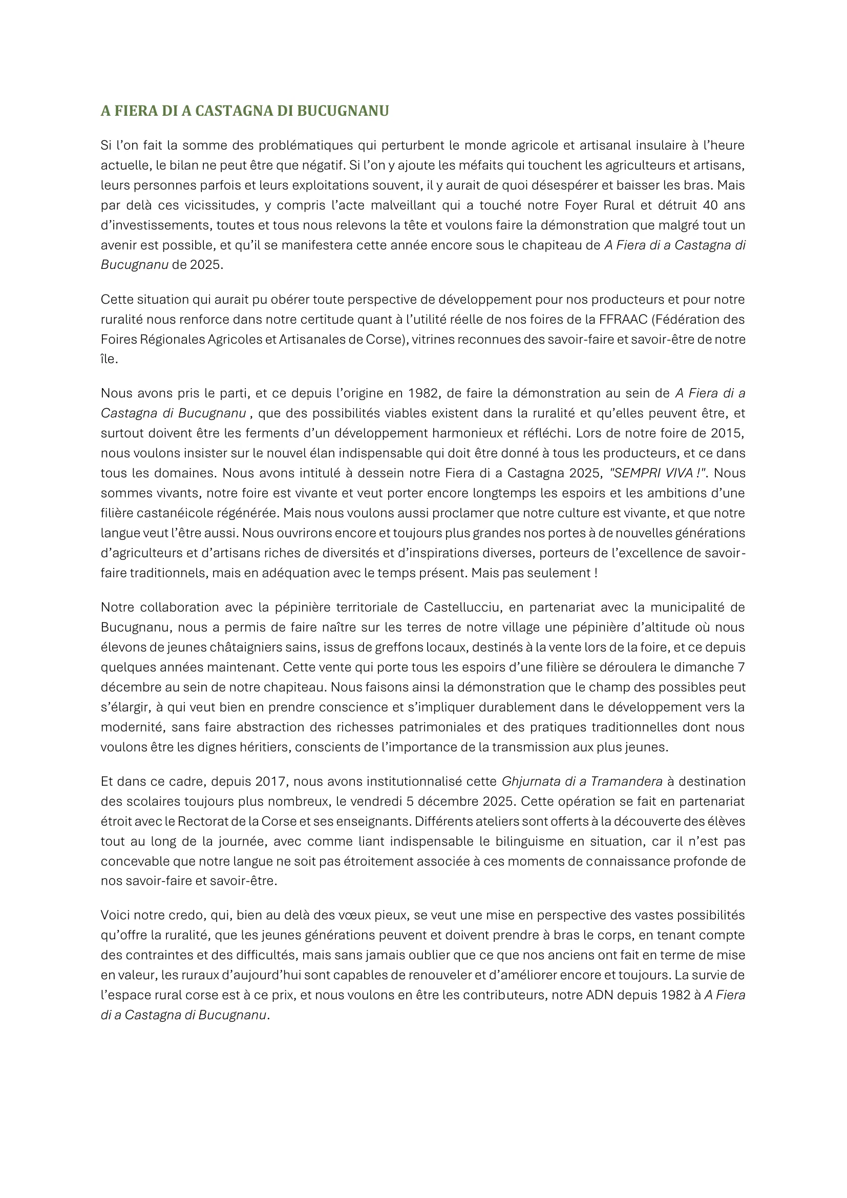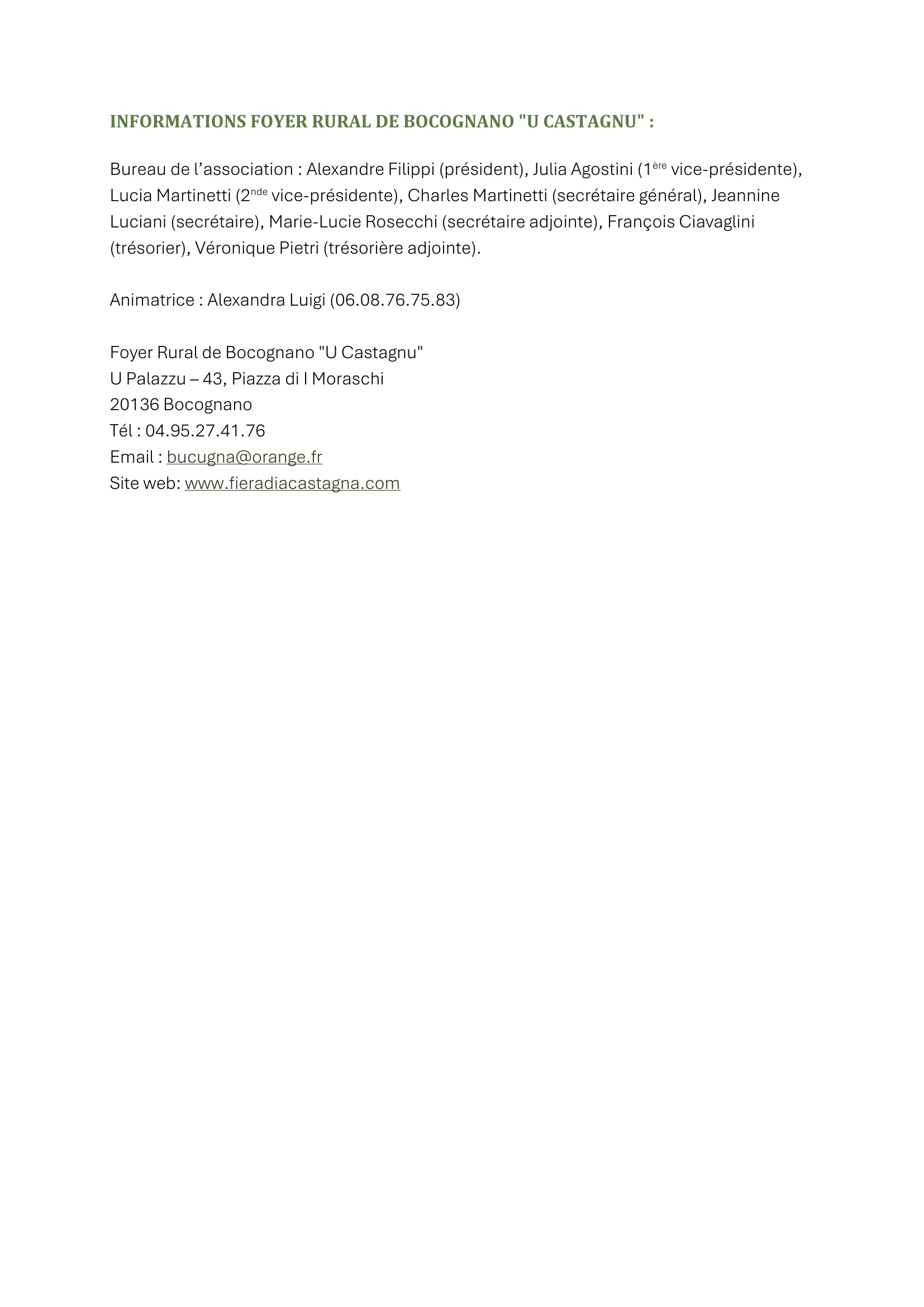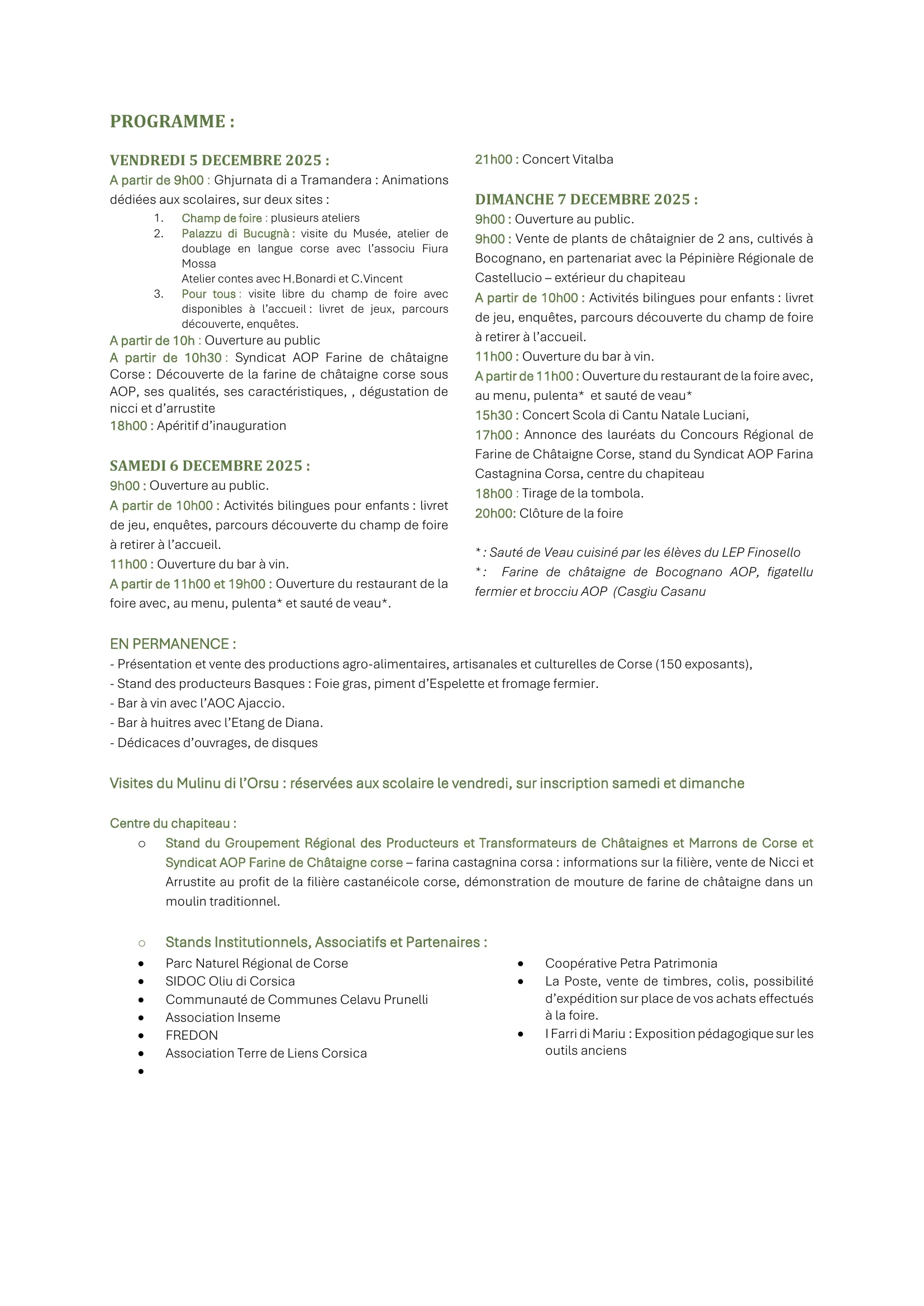 17h00 : Annonce des lauréats du Concours Régional de Farine de Châtaigne Corse, stand du Syndicat AOP Farina Castagnina Corsa, centre du chapiteau